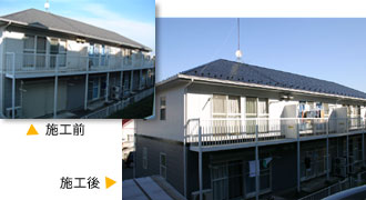 全体的に経年劣化を起こしている案件でした。外壁のサイディングボードを繋げる役目のシーリング材も弾性が失われおり、建物の挙動に追従できなくなり、亀裂や剥離が発生しています。このまま放置すると、漏水の原因となり、建物の耐久性に影響します。その為、窯業系サイディングボード専用シーリング材で打ち替えるなど、丁寧な下処理が必要になります。 また屋根も塗膜が劣化し色あせ、チョーキングを起こしており、この放置するとコケ・藻の繁殖が懸念される状態でした。今回は表層の脆弱層を除去した後、防水力復元の為、専用プライマーによる吸水防止処理を施しさらに、防カビ防藻機能付きの高耐久性塗料塗装により撥水化粧処理を施しました。